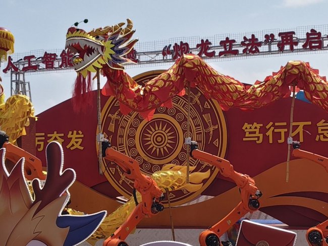 (人工智能机械臂操控微型炮龙在凤凰湖公园“舞动”)