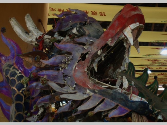 (馆内陈列的一尊色彩斑驳、略显残破的古炮龙头)