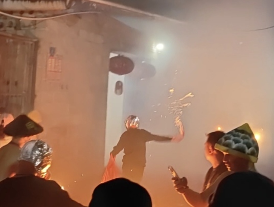 夜幕降临,宾阳的年节气氛被推向高潮。调研团分为两组,王心怡、刘紫欣前往炮龙文化园记录现场活动,魏珂昕、曾宇瑶、叶书豪则深入炮龙老庙周边街区。此时,通往老庙的各条街道早已人声鼎沸,水泄不通。当炮龙“开光”启动,霎时间锣鼓震天,鞭炮齐鸣,火光将夜空映照得如同白昼。 舞龙者们赤膊上身,肌肉贲张,挥舞着沉重的龙身,人群随着炮龙的舞动而涌动。调研团成员注意到,许多兴奋的游客穿戴好防护装备,点燃特制鞭炮后掷向龙身,亲身体验“炸龙”这一被视为祈福祛邪的特色民俗。