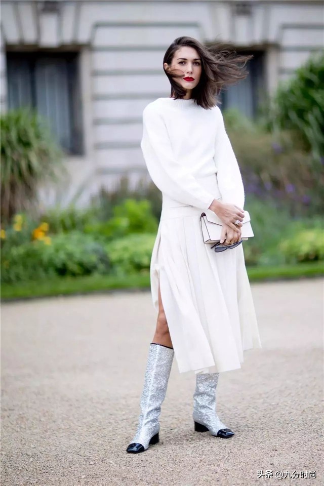 不过,大家也可以尝试一些比较个性的同色系搭配,利用同色系的搭配来让整体造型保持协调统一,能够轻松地降低重量感,显得轻松许多,像下面这一身白色搭配就很清爽,而且结合了长筒靴保暖效果还不错。