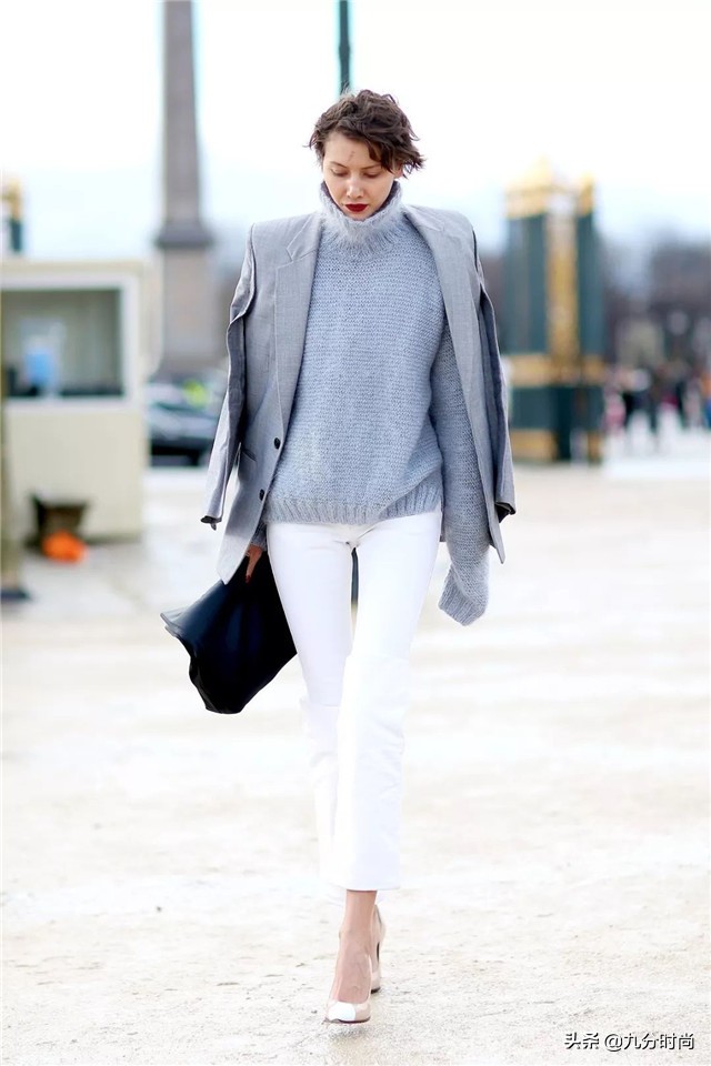 而且在秋冬季节,大家可以利用一些深浅结合的搭配,像深色系的毛衣,可以搭配浅色系的直筒裤,通过颜色上做到相互结合,相互呼应,便能够轻松的演绎出个性的魅力,下面这一种小高领的毛衣,搭配了白色直筒裤,给人的感觉就特别清爽,顺便露出脚踝也更显瘦。